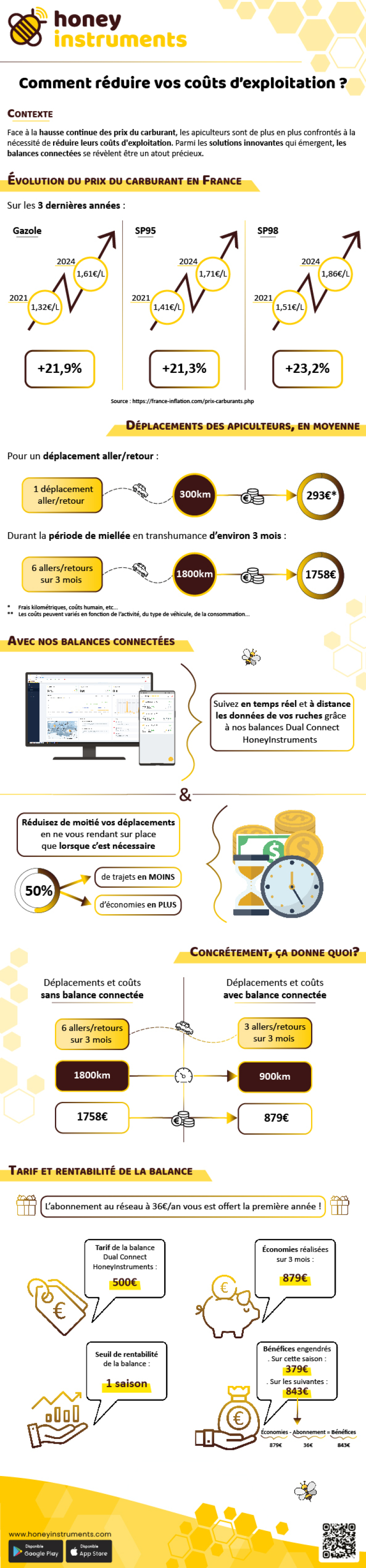 Ante el continuo aumento de los precios del combustible en Francia, los apicultores están cada vez más obligados a optimizar sus desplazamientos para reducir los costos de explotación. El precio del gasóleo, SP95 y SP98 ha aumentado respectivamente entre un 21% y un 23% en los últimos tres años, lo que afecta directamente a los presupuestos relacionados con los desplazamientos de los apicultores.